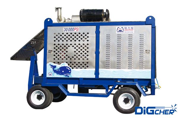德高潔 DJ 2000/20DT 2000公斤壓力進口柴油超高壓清洗機采用康明斯95kw柴油發(fā)動機作為動力源,高壓泵為美國原裝三柱塞泵,設計有三級進水過濾器,并采用特種不銹鋼泵頭、不銹鋼閥門及柱塞、高技術密封填料;曲軸箱采用飛濺潤滑;設計有變頻調速系統(tǒng);配備氣動旋轉槍;安全閥采用爆破膜式,安全可靠。